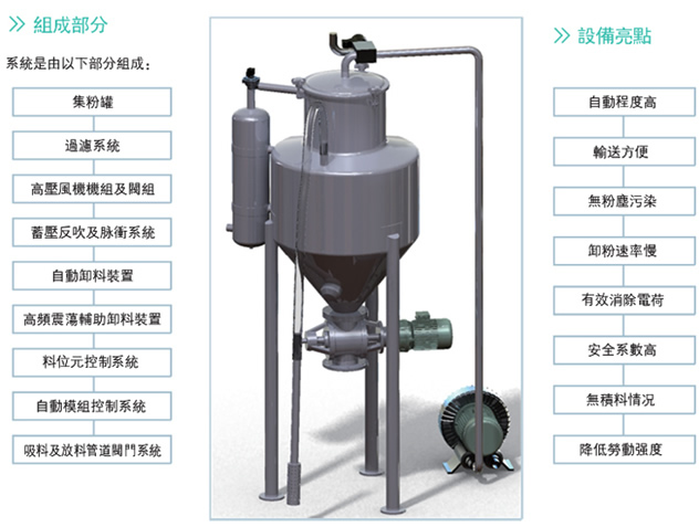 真空粉體輸送系統是通過真空吸氣達到粉體輸送的目的,再結合過濾、反吹、放料、閥體控制等綜合因素集成的系統。系統主要應用于輸送粉狀料、粒狀料、粉粒料混合料等物料;系統能自動地將各種物料輸送到包裝機、注塑機、粉碎機等設備的料斗中,也能直接把混合的物料輸送到混合機和各類混合反應罐中,解決了加料時粉塵問題,減輕了工人勞動強度,是粉體輸送的首選系統。
